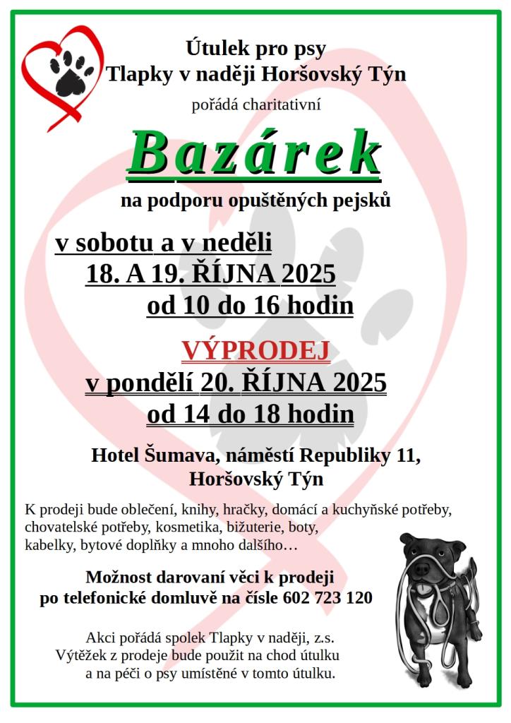 Útulek pro psy Tlapky v naději Horšovský Týn pořádá charitativní bazárek na podporu opuštěných pejsků.