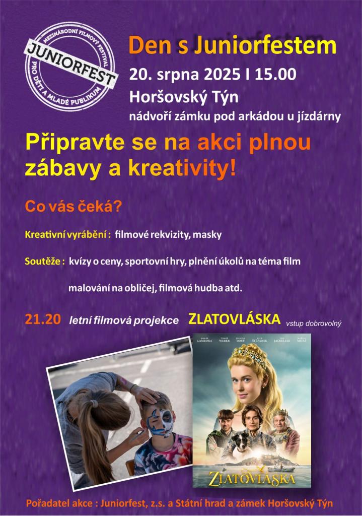Den s Juniorfestem nabízí návštěvníkům jedinečnou příležitost zapojit se do kreativního vyrábění, kde si mohou vyrobit filmové rekvizity a masky. Kromě toho se můžete těšit na soutěže, kvízy o ceny a sportovní hry zaměřené na filmové téma. Večer zakončí letní filmová projekce pohádky Zlatovláska. Přijďte si užít den plný zábavy a kreativity!