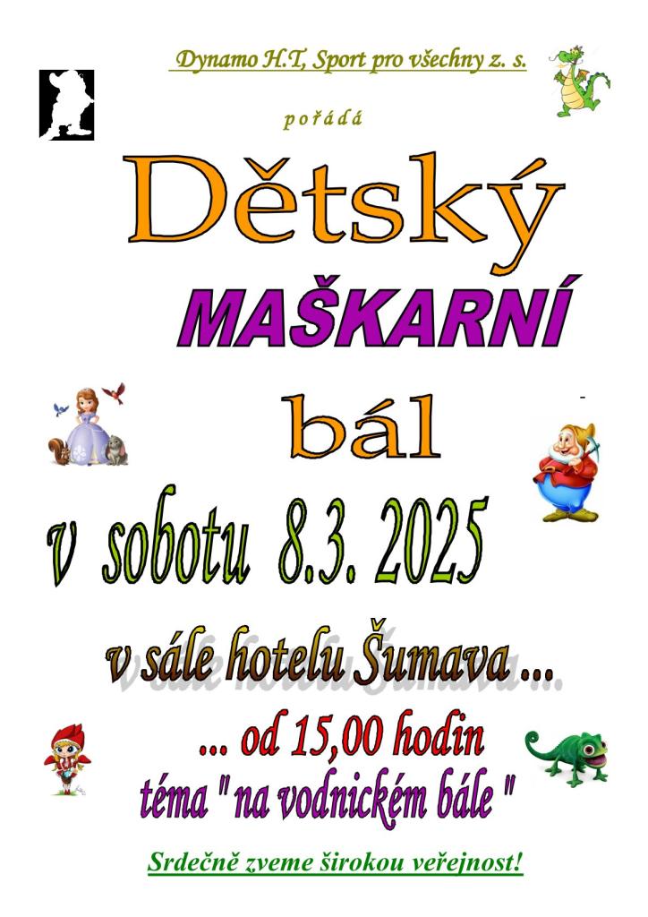Dynamo HT Sport pro všechny z. s. pořádá dětský maškarní bál v sobotu 8. 3. 2025 od 15:00 hodin, sál Šumava.