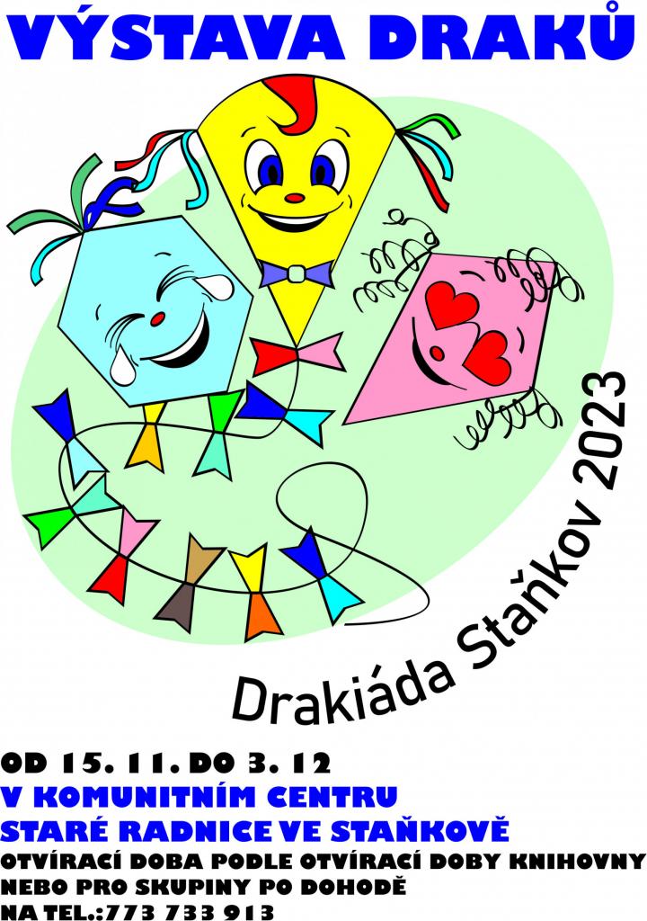 Bohužel nám počasí letos opravdu nepřálo a tak jsme se s draky nemohli rozeběhnout jako vloni. Protože jsme však byli na dětské draky opravdu natěšení, uspořádali jsme alespoň jejich výstavu v Komunitním centru Staré radnice. Prohlédnout si ji můžete ve výpůjčních hodinách knihovny.