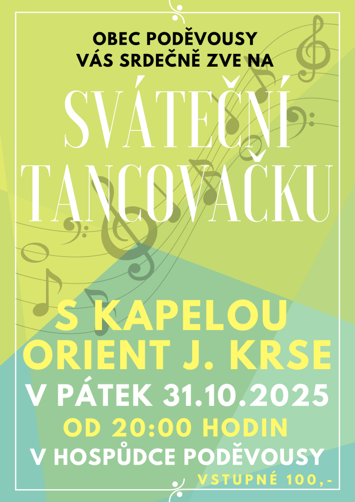 Obec Poděvousy srdečně zve na sváteční tancovačku s kapelou ORIENT J. Krse, která se koná v pátek 31. října v hospůdce Poděvousy. Přijďte si užít příjemný večer plný tance a zábavy. Tato akce je určena pro všechny, kdo mají rádi hudbu a tanec. Těšíme se na vaši účast!